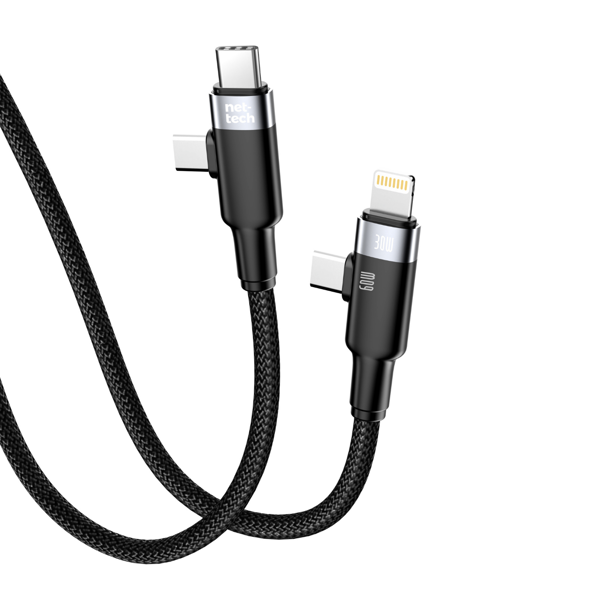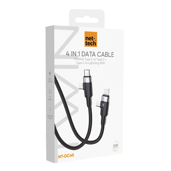 Nettech NT-DC45 60W+30W Plastik 100 Cm Type-C To Type-C+Lightning Şarj ve Data Kablosu (Siyah) NT-108316